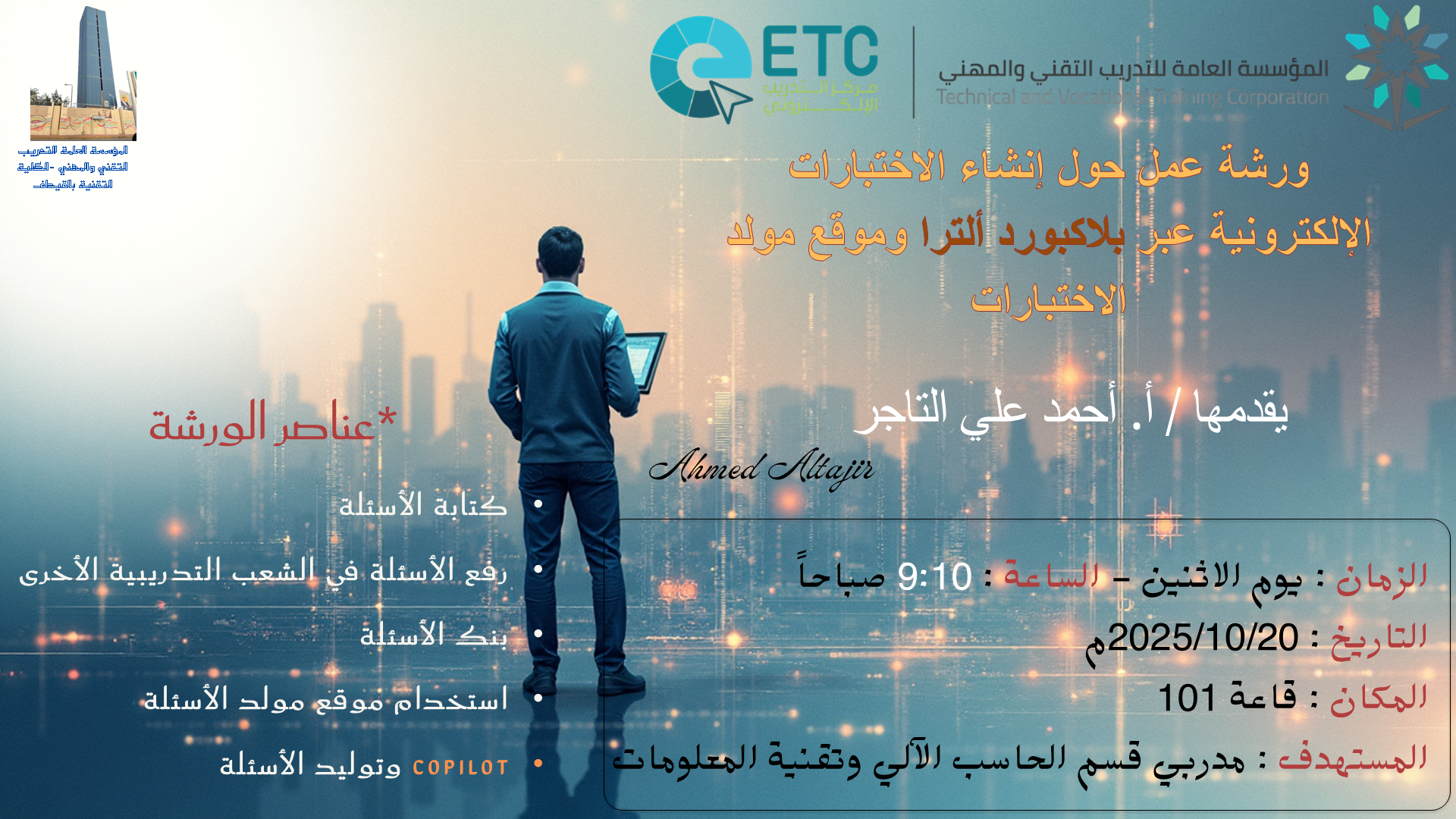 وقد ركز التاجر في ورش العمل على عدة عناصر أهمها كيفية كتابة الأسئلة على منصة التدرب الإلكتروني الجديدة " البلاك بورد الترا " والمخصصة للمؤسسة العامة للتدريب التقني والمهني وكيفية رفع الأسئلة في الشعب التدريبية وطريقة نسخها إلى الشعب الأخرى كما تطرق لكيفية تكوين بنك الأسئلة للشعب التدريبية والاستفادة منها في تكوين الاختبارات المختلفة .